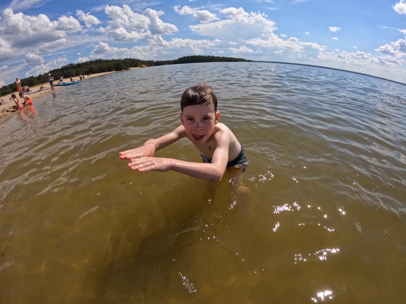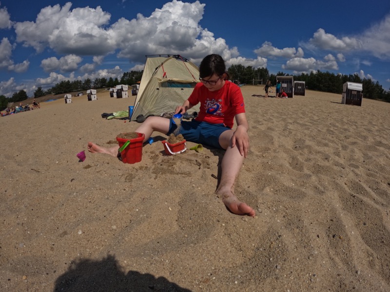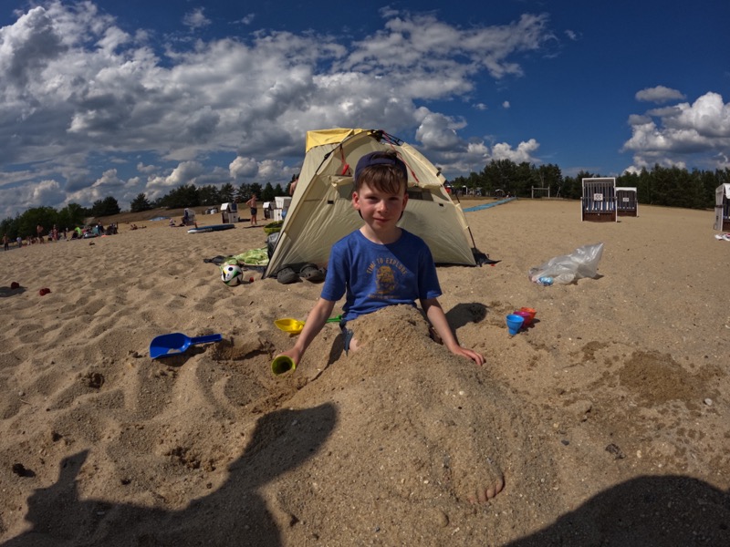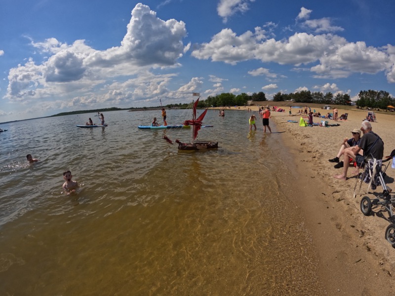 Der Tag heute sollte uns wettertechnisch mit viel Sonne belohnen. Geplant hatten wir baden zu gehen und das taten wir dann auch. Also packten wir unsere Badesachen und ab den Strand des Bärwalder Sees. Am Strand angekommen setzte gerade ein älterer Mann ein selbstgebautes Kriegssegelschiff ins Wasser. Es war ein Nachbau eines Holländischen Kriegsschiffes um 1830 welches der Kapitän persönlich im Meer versenkte, bevor es anderen als Kriegsbeute in die Hände fiel. Er erzählte, dass er 1900 Stunden an dem Teil gebastelt habe, bis es das erste mal ins Wasser gesetzt wurde. Mit einer Fernbedienung steuert er die Segel und das Schiff fährt nur durch die Windkraft. Echt spannend. Mit den Kids haben wir dann noch Ball, Bowle usw. gespielt und sind natürlich auch ins Wasser gegangen. Zum Abschluss des Tages haben wir noch gegrillt.