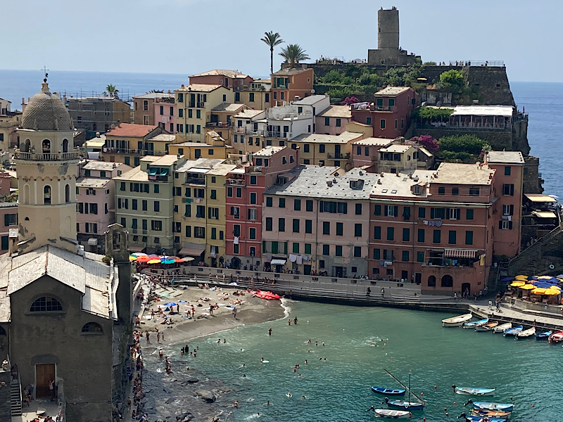 An diesem Tag wollten wir noch die 2 letzten Dörfer der Cinque Terre (Vernazza, Monterosso) mit dem Zug besuchen. Wir haben also wieder unsere sieben Sachen gepackt und sind zum Zug, mit dem Ziel Vernazza, gelaufen. Vernazza wird als das schönste der Dörfer der Cinque Terre bezeichnet. Farbenfrohe Häuser ergeben ein buntes Mosaik, so wie sie in die Felsen gebaut sind. Der Hafen wird von vielen Einheimischen und Touristen zum Baden genutzt. Es gibt auch wagemutige die von herausragenden Felsen aus dem Wasser herunterspringen. Wir sind dann noch ein Stück auf den Wanderweg nach Monterosso gelaufen, um noch ein paar schöne Fotos zu schiessen. Danach sind wir dann zurück zum Bahnhof und weiter nach Monterosso gefahren. Monterosso ist das nördlichste Dorf und der größte Ort der Cinque Terre. Hier findet man die meisten Hotels, Cafés, Restaurants und Einkaufsmöglichkeiten. Außerdem findet sich hier der einzige große Badestrand der Cinque Terre. Wir sind erst einmal den langen Badestrand entlang und dann zurück durch einen Tunnel um in die Altdorf zu kommen. Ich finde es allerdings nicht das schönste Dorf, aber zum Baden geht ist es in Ordnung. Wir haben einen Abstecher durch das alte Monterosso gemacht und sind anschließend wieder zurück nach Levanto. Hier waren wir dann kurz am Campingplatz und sind anschließend noch Baden gegangen. Am Abend waren wir dann noch essen und haben den Trachtenumzug der umliegenden Dörfer und Städte miterlebt (Festa del Mare).