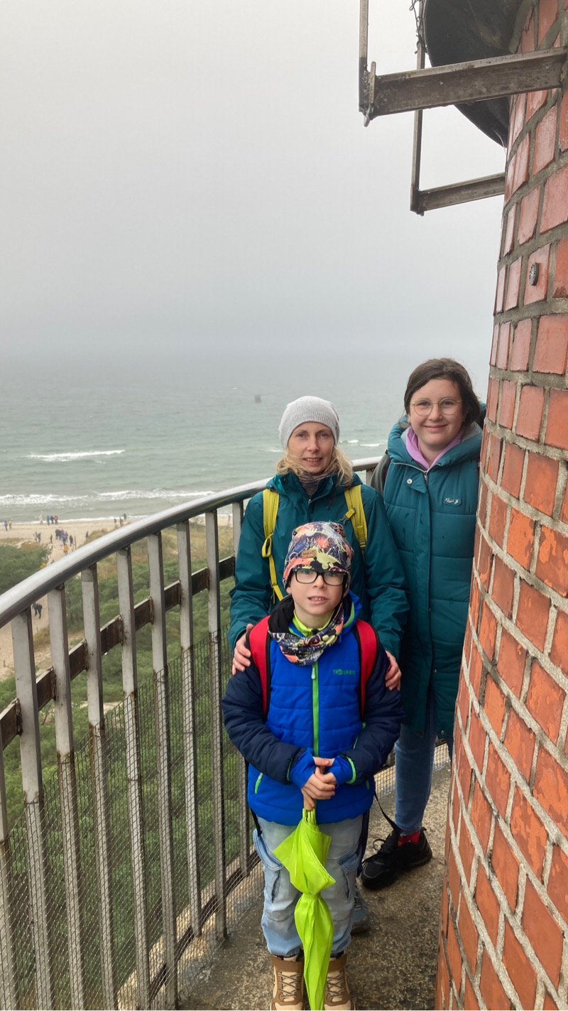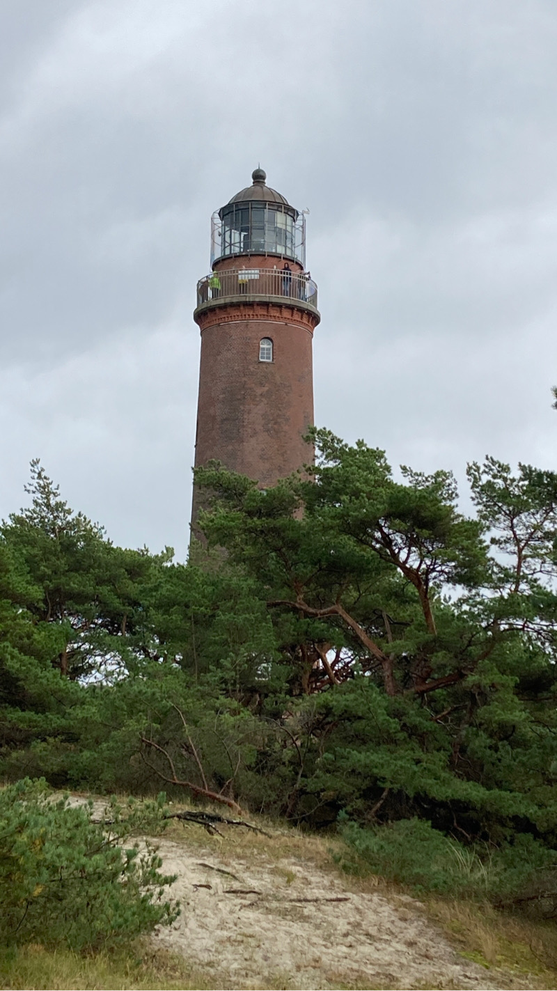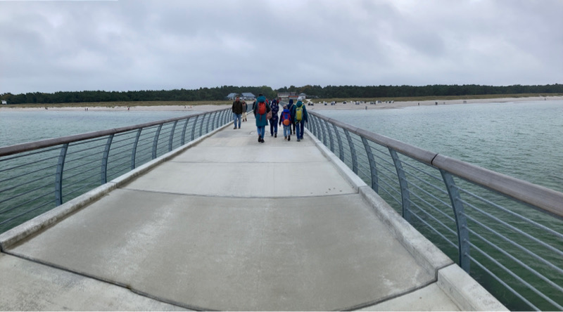 Als erstes sind wir heute von Prerow aus mit der Pferdekutsche zum Darßer Ort gefahren. Der Darßer Ort ist die Nordspitze der Halbinsel Darß. Dort angekommen haben wir das NATUREUM und den Leuchtturm besucht. Das NATUREUM ist ein kleines Naturkunde-Museum im Nationalpark „Vorpommersche Boddenlandschaft“ beherbergt seit 1991 Ausstellungen zum Naturraum Darßer Ort, zur Ostseeküste und zu den Tieren der Region. Nebenbei kann man den Leuchtturm begehen, wo man einen schönen Ausblick in die Darßlandschaft hat. Nach der Rückfahrt mit der Pferdekutsche haben wir lecker Kaffee getrunken und sind dann zur längsten Seebrücke (720 m) der Ostseeküste gelaufen. Das letzte mal als wir hier waren, war diese noch im Bau und ist nun seit Oktober 2024 für Besucher geöffnet. Notwendig wurde der Umbbau weil der Nothafen am Darßer Ort schließen musste. Am Ende befindet sich der hufeisenförmig angelegte neue Inselhafen. Er bietet Platz für Fischkutter, Sportboote sowie den Seenotrettungskreuzer „Nis Randers“. Am Anfang der Brücke befindet sich eine große Aussichtsterrasse. Von dort aus hat man einen guten Blick über die Ostsee und sogar bis nach Hiddensee bei schönem Wetter.